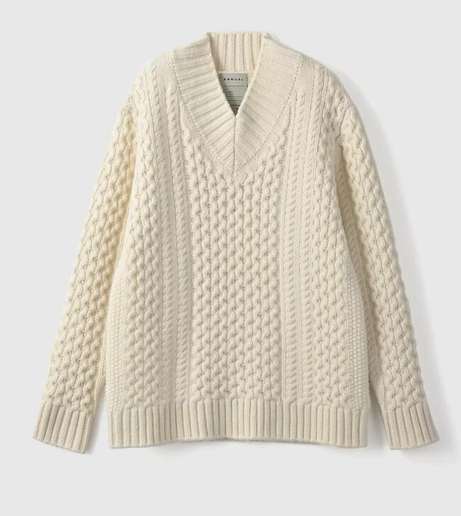 襟がVネックになっており、すっきりとした印象のフィッシャーマンズセーター。