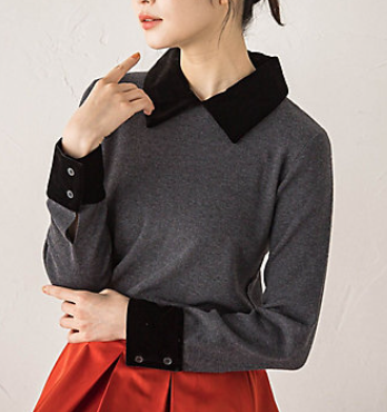 衿とカフスに光沢感のあるベロア素材を使用したエレガントで女性らしい雰囲気のあるニット。