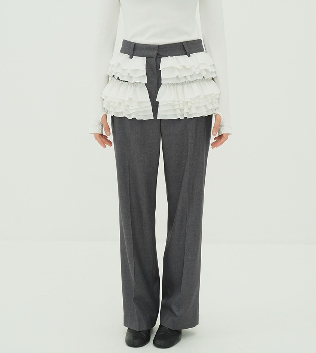マニッシュなスラックスに、フェミニンなフリルディテールをふんだんに施したパンツ。