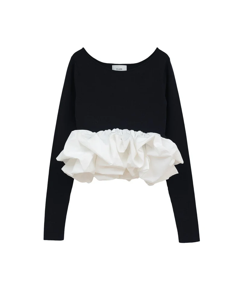 腰回りにたっぷりとあしらったフリルが、立体的で動きのある印象を引き立て、パンツとフリルで素材を切り替えることで、奥行きのあるデザインに仕上げられています。