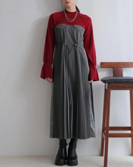 ベアワンピースとニットトップスのレイヤードスタイルが1枚で完成するドッキングワンピース。