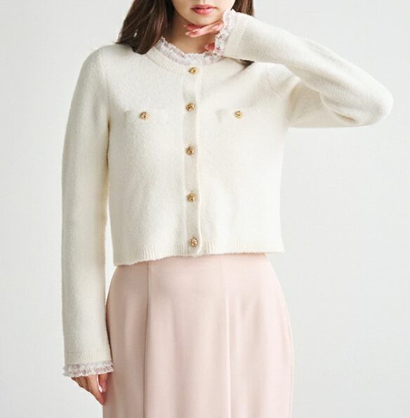 ゴールド調のボタンが華やぎを添え、クラシカルなアクセントを効かせています。