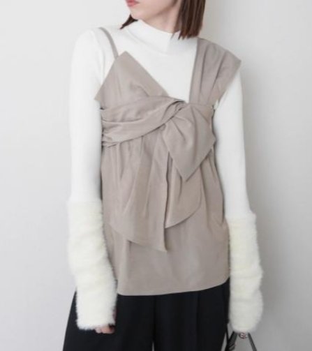 大胆なボリュームのリボンディテールが目を惹くキャミソール型トップスで、一枚でもレイヤードでも活躍します。