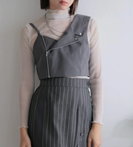 シンプルなハイネックリブニットとインパクトのあるリボンペプラムキャミのセットアイテム。