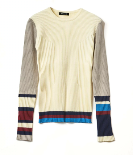 今年は身頃と袖が配色で、左右の袖口がアシンメトリーなマルチボーダー、裾の3本配色ラインがポイント。