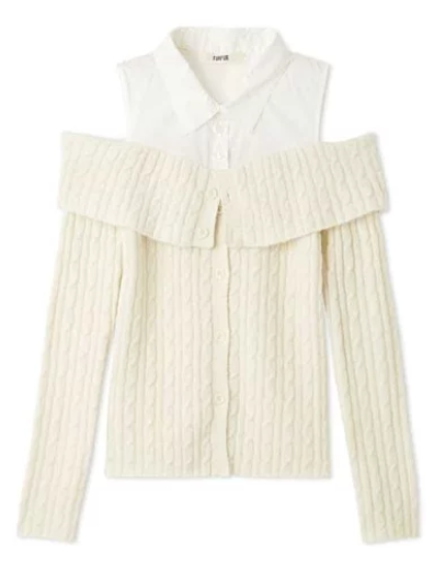 ノースリーブのシャツがレイヤードされたオフショルダーのニットプルオーバー。