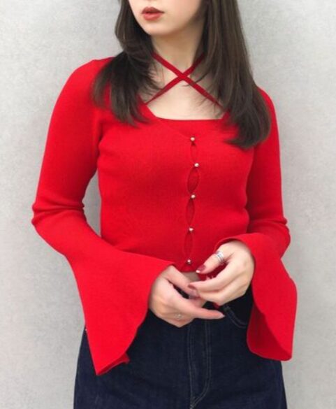 フィット感のあるリブ編地とフレアスリーブのバランスがメリハリのあり女性らしいシルエットを叶えます。