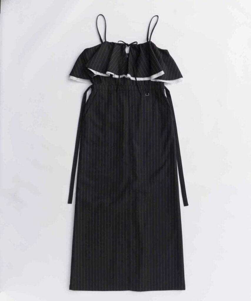 胸元のフリルディテールが程よくフェミニンな印象を添え、シンプルながらも存在感のある一着に仕上がっています。