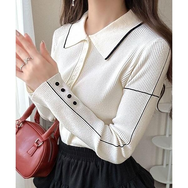 クラシカルなムード漂う配色切り替えのポロリブニット。