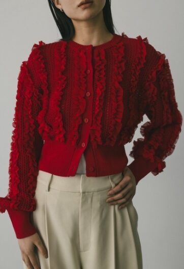 ドライタッチの糸で編み立てたニットにチュールフリルをドッキングさせた凹凸のある華やかなニットカーデ。