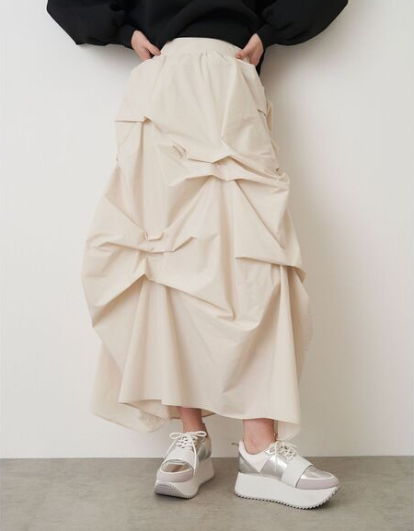 タックが作るイレギュラーな動きがモードな雰囲気でありつつ、ランダムなふくらみが女性らしい印象も与えてくれる1枚です。