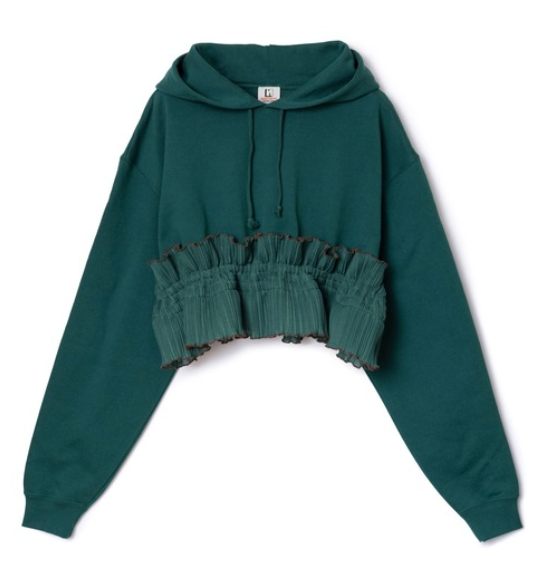 裾にフリルパーツがドッキングしたプルオーバーパーカー。