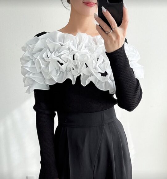 フリルのボリュームにコントラストをつけているのですっきりと着用頂きやすい一枚です。