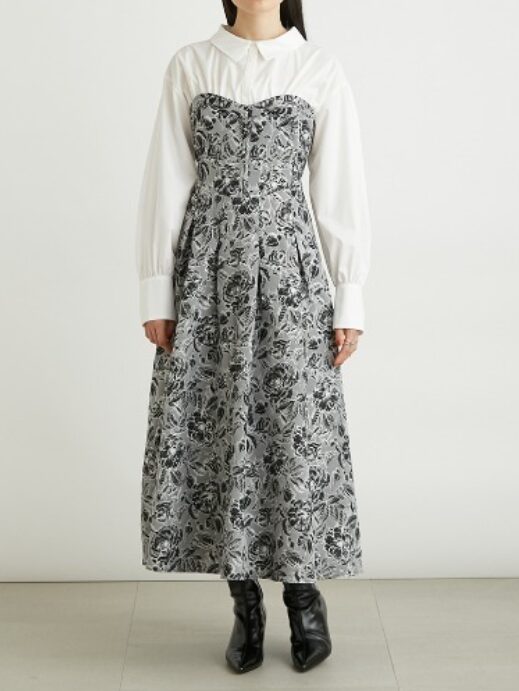 シャツとビスチェワンピースをレイヤードしているようなデザインのドッキングワンピース。
