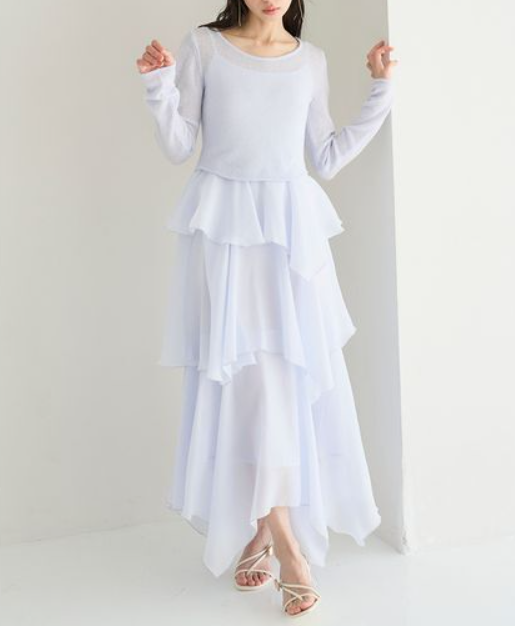 ワンピースのティアードスカート部分は、艶感のある軽やかなオーガンジー素材を使用。