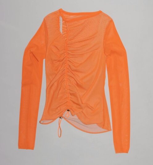 肩山から肘あたりにかけてフォルムスリーブになっており、モードの雰囲気を与えつつ、二の腕カバーも叶う一枚。