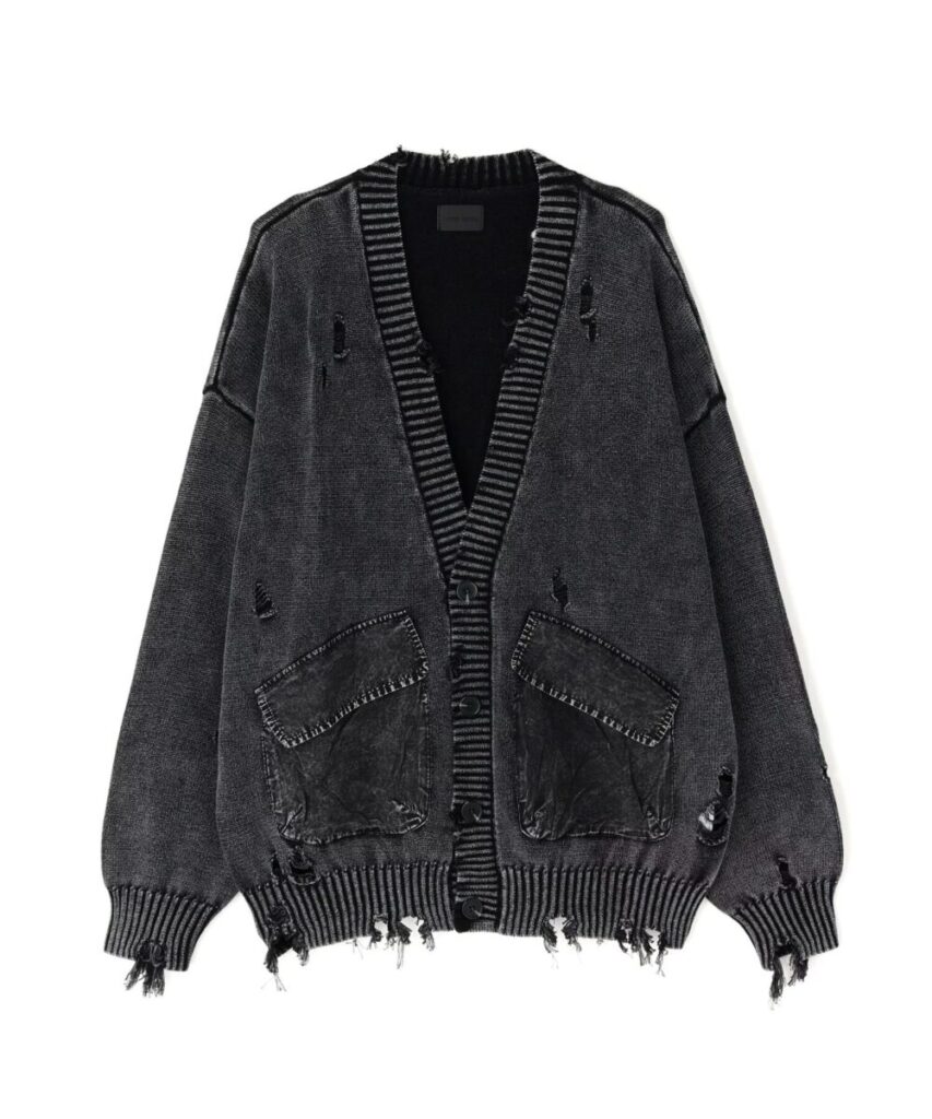 “クラッシュとクラフトが融合する、表情豊かなニットカーディガン。”