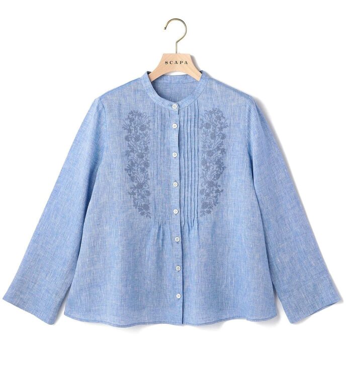 胸元にエンブロイダリーのフラワーモチーフをあしらったブラウス。