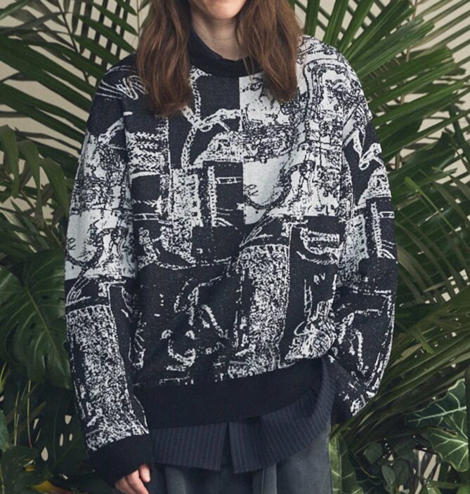 計算された2色の配色と、ポリエステルのループ糸を使用する事で立体感のあるジャガード編みの風合いが絶妙にマッチした一着に。