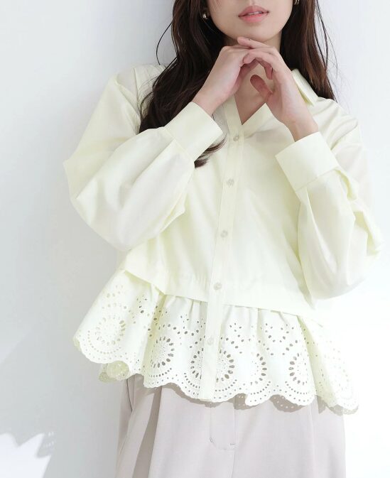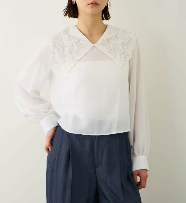 シャツ衿の端にはスカラップレースを挟み込み、顔周りを華やかに演出しながら、クラシカルで繊細なムードをプラスしてくれます。