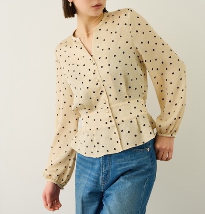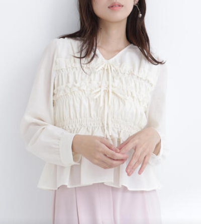 フロントリボンと身頃のシャーリングがポイントのペプラムブラウス。