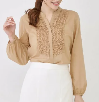 華やかな胸元のフリルがポイントの主役級ブラウスは、シンプルスカートを合わせて上品に。