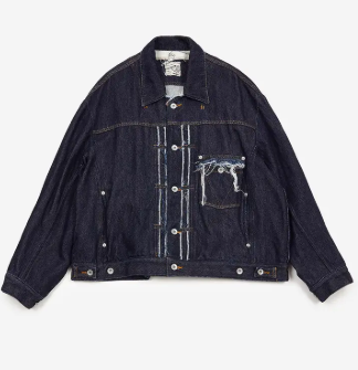 経糸に8番手インディゴ染めのムラ糸、緯糸に普通のデニムより太い5番手の甘撚りのスラブ糸を使用した、ふっくらとしたやわらかい手触りが特徴のブルゾン。
