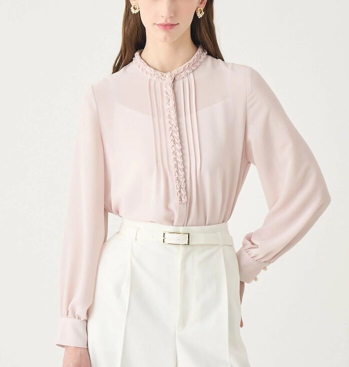 胸元ピンタックと肩フリルがさりげない女性らしさを演出するブラウス。