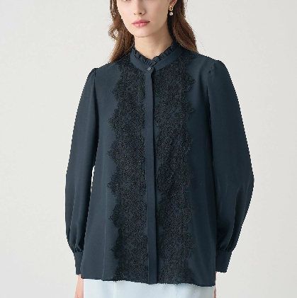 立体的なテクニカル刺繍が、首元と前立てに施され、顔周りをとても華やかに彩るブラウス。