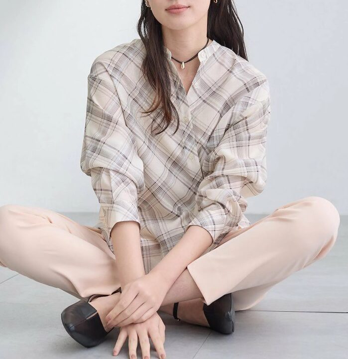バイアス柄のチェック柄と無地の展開のあるシアーシャツ。