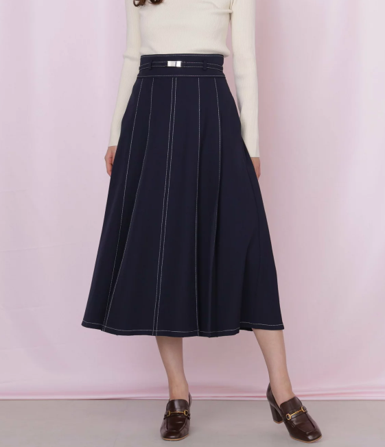 配色ステッチとベルトでメリハリを出したフレアスカート。