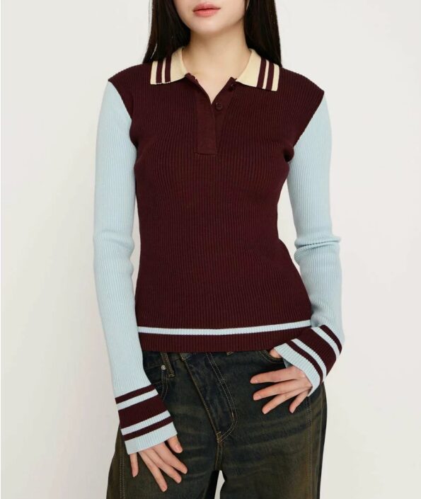 バイカラー配色と襟や裾のラインがポイントとなった襟付きニットトップス。