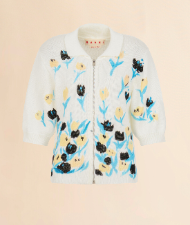 フロントには手描きのアートワークを思わせるフリーハンド効果の花柄がプリントされた、コットン製の半袖カーディガン。