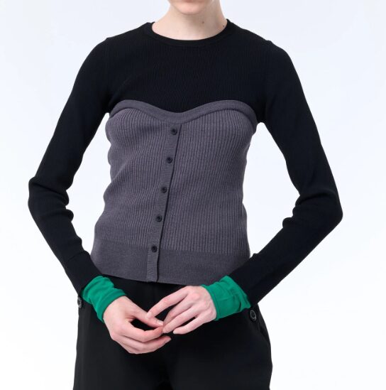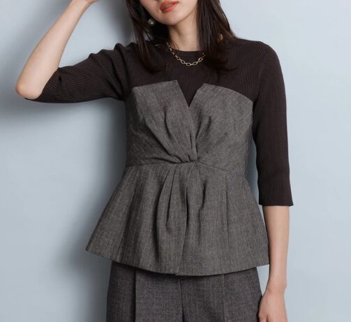 べーシックなリブニットに、ビスチェをレイヤードしたようなドッキングデザインのニットプルオーバー。