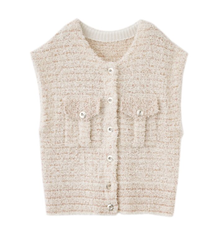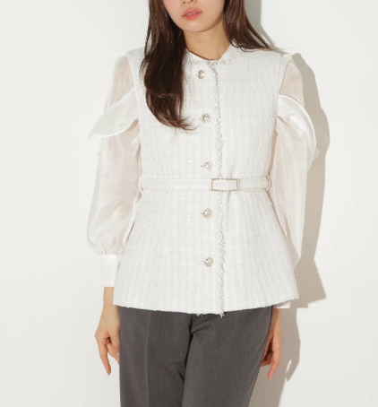 トレンド感のあるツイード素材のジレは、一枚羽織るだけでぱっと華やかな印象に。