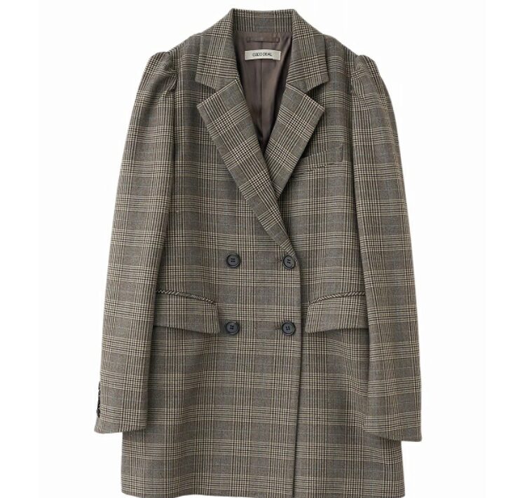 前開きをマニッシュなダブルにしながらも、贅沢なボリューム感のパフスリーブデザインで程よくフェミニンさもプラスしてくれます。