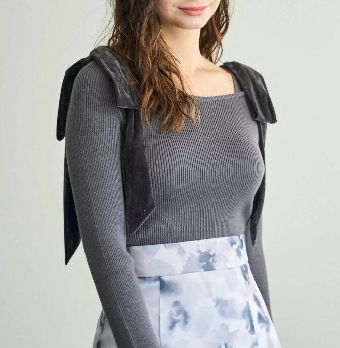 肩のリボンデザインが女性らしさを引き立てるリブニット。