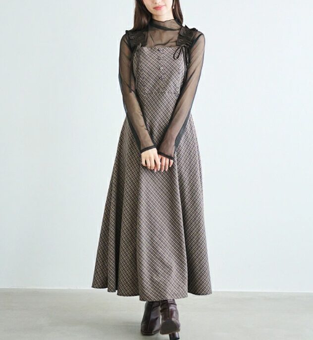 肩のフリルストラップが目を引くキャミワンピースは、女性らしさと着回し力を兼ね備えた一枚。