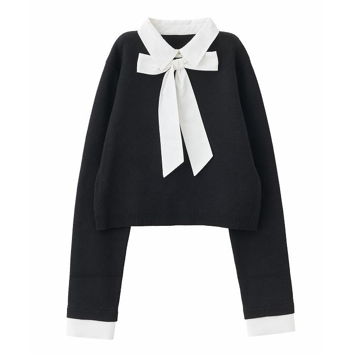 ボウタイブラウスをレイヤードしたようなコーディネートが簡単に完成するニットプルオーバー。