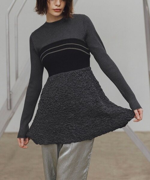 トップスはドライタッチな糸を使い、ツイード風なMIXカラーと凹凸を出した編地です。