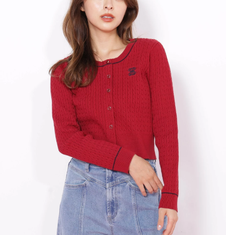 ミニケーブル編みと配色ライン、胸元には刺しゅうロゴを入れたコンパクトカーディガン。