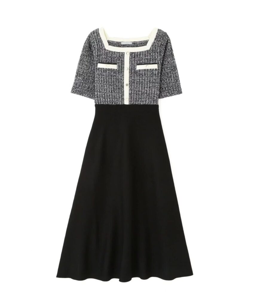 ツイードニットジャケットとスカートをドッキングしたニットワンピース。