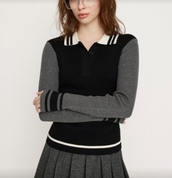 バイカラー配色と襟や裾のラインがポイントとなった襟付きニットトップス。