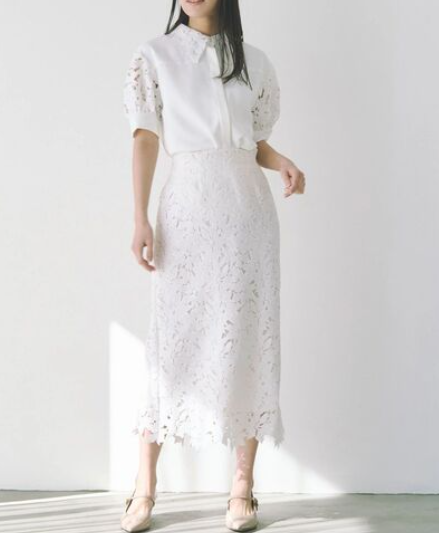存在感のあるフラワーモチーフの立体レースを贅沢に使用したIラインスカート。