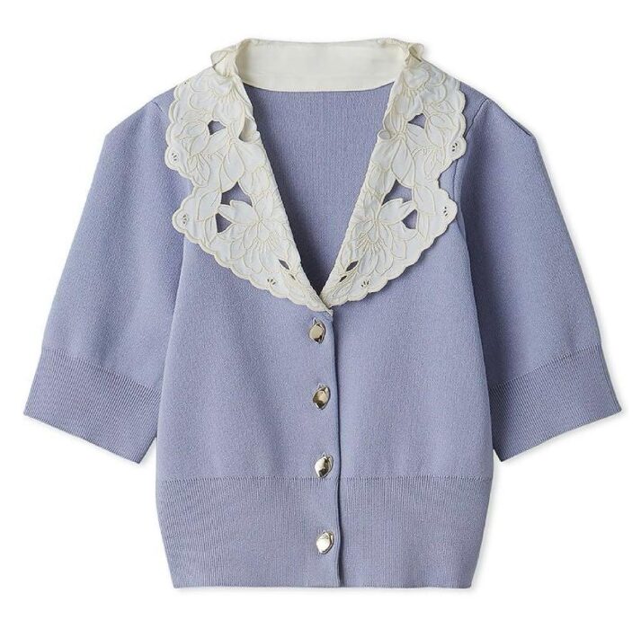 刺繍を施したフラワー柄のエンブロイダリーレース襟が華やかな半袖カーディガン。