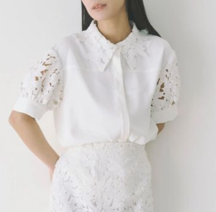 袖には立体感のあるケミカルレースを使用し、程よい透け感が涼しげで女性らしい印象を演出します。